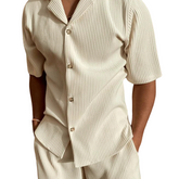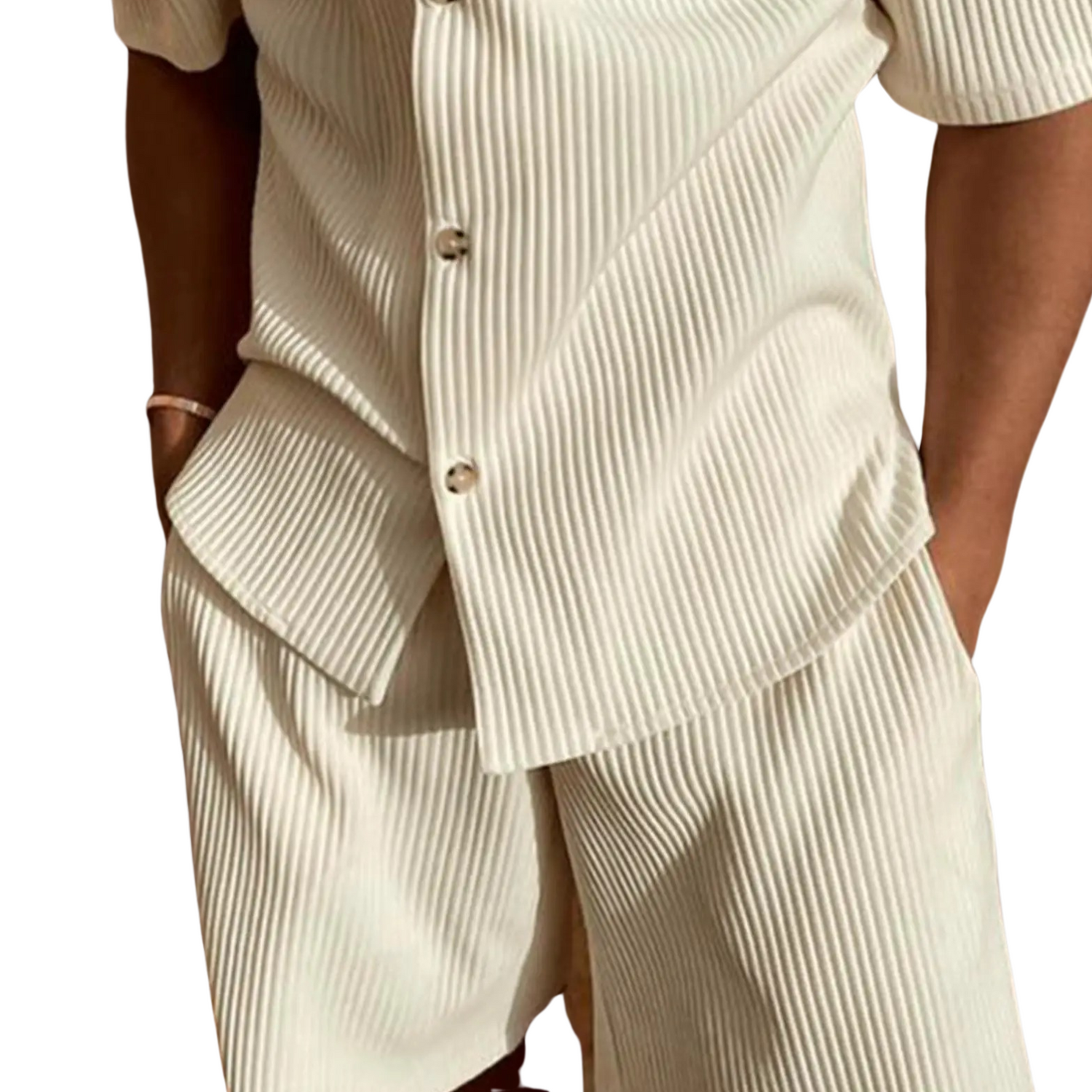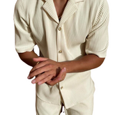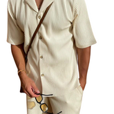 חליפת ליני בז' היא המושלמת לכל גבר שרוצה להיראות אלגנטי אך עם נגיעות של קז'ואל. החולצה מגיעה עם כפתורים קדמיים וגזרה קלילה שמתאימה לכל פעילות קיץ – טיולים, יציאות, או יום רגיל בעיר. המכנס הקצר בעל גזרה נוחה ומותן גמישה, מתאימה במיוחד לחום של הקיץ.