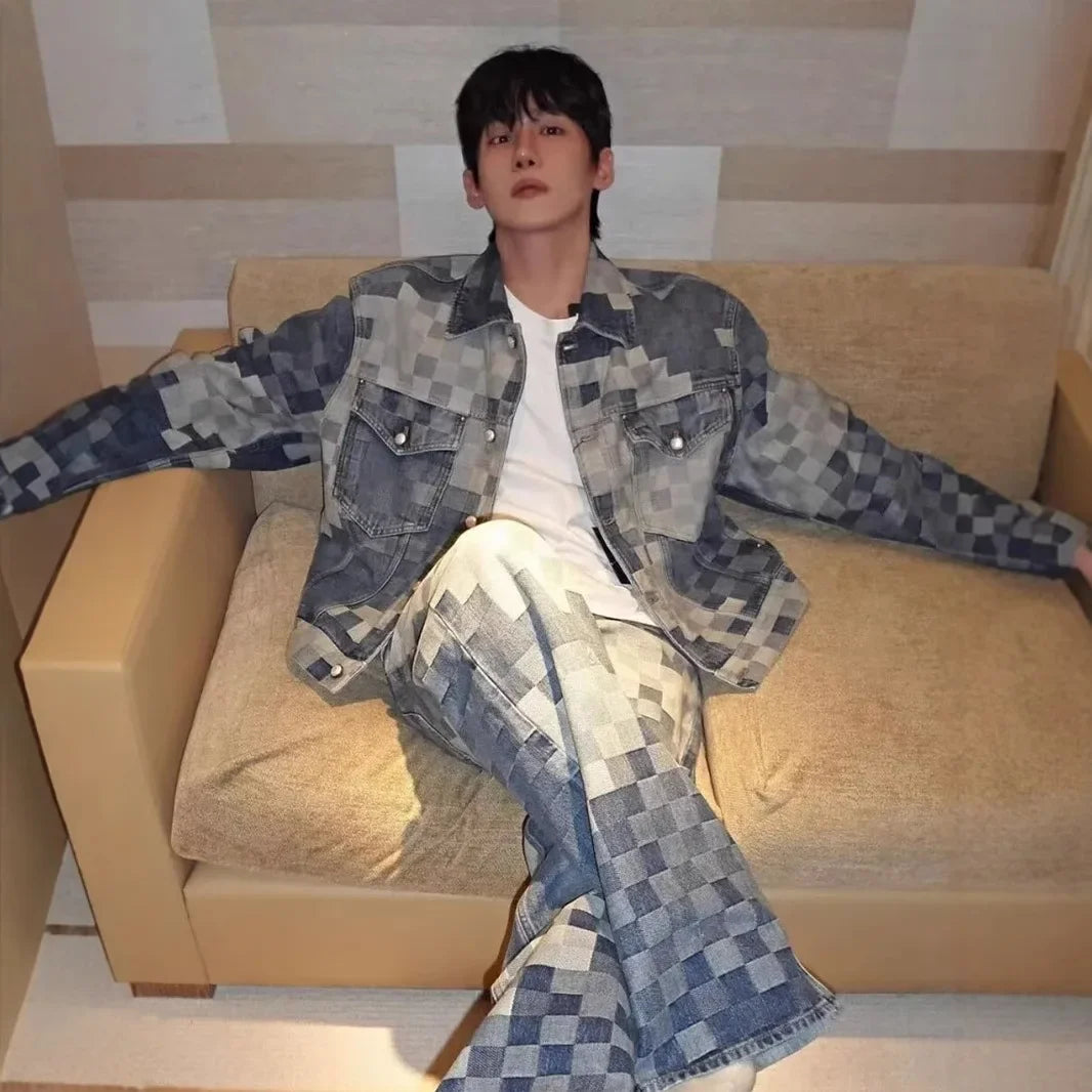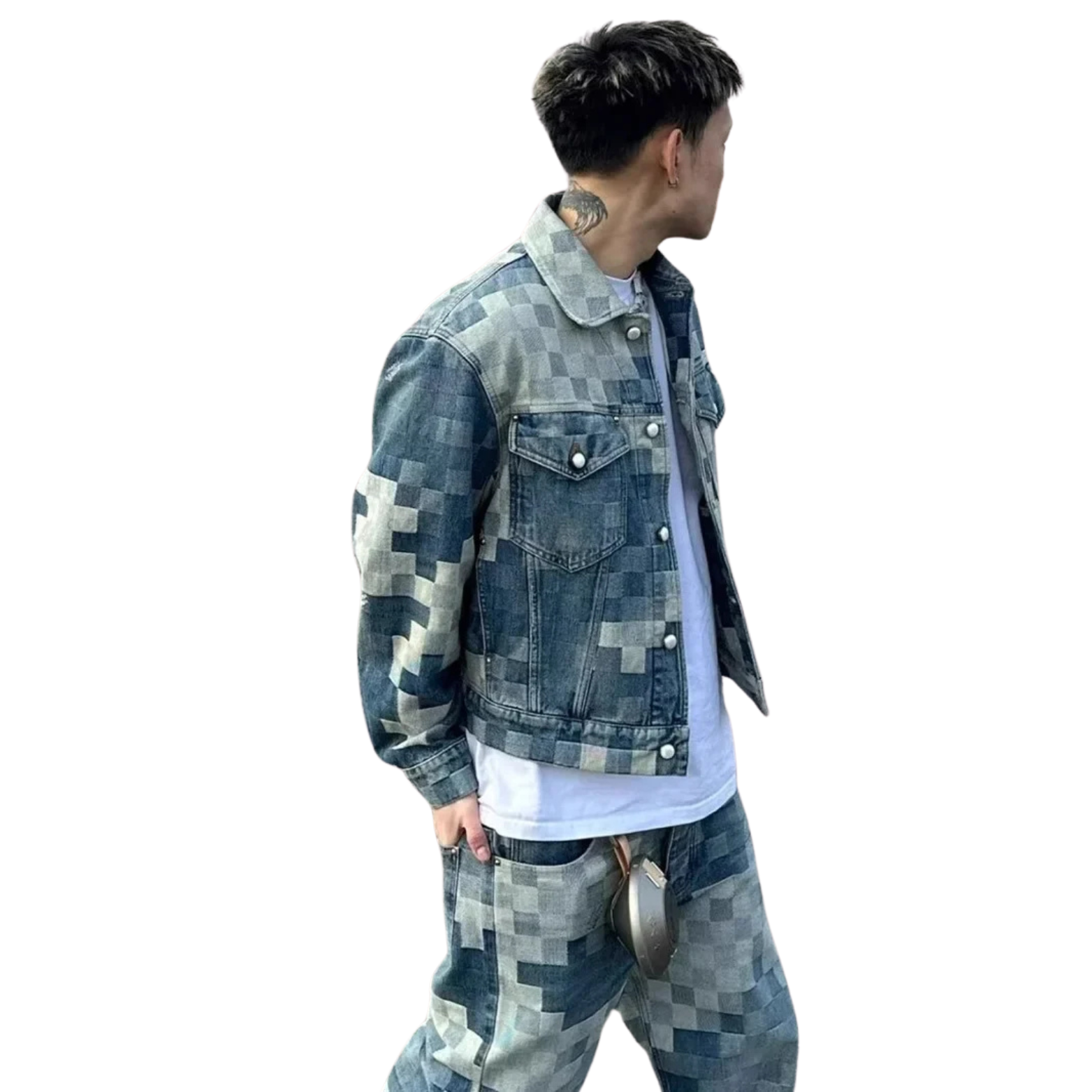 ככה נראה דנים כשנותנים לו טוויסט מהעתיד חליפת ג׳ינס מטורפת עם הדפס פיקסלים שמשלב בין רטרו למשחק מחשב חי על הגוף. הג׳קט בגזרה קלאסית עם כיסים קדמיים, והג׳ינס רחב ונינוח, כמו שצריך בשביל וייב רחוב אמיתי.