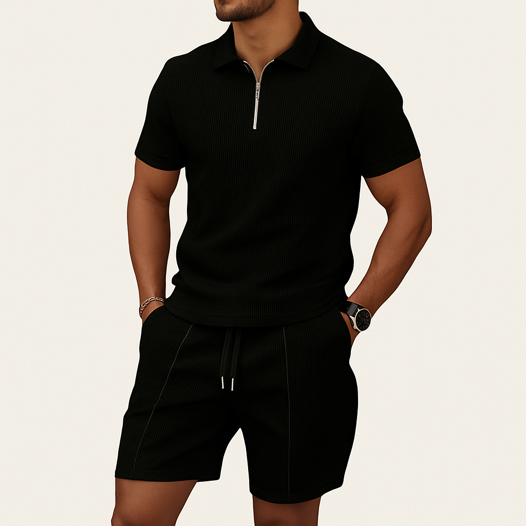 Meet the Leon Suit – a flattering summer men's suit in black with a perforated texture. The shirt features a zipper at the neckline, adding an elegant touch and allowing for personalized opening and adjustment to your style.