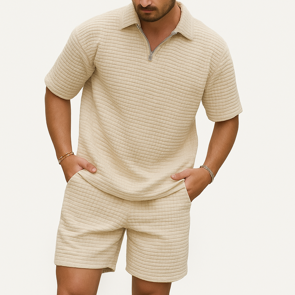 A modern and flattering men's set in beige, featuring a unique perforated texture that gives it a trendy and clean look. The set includes a short-sleeved shirt with a zipper at the neckline, adding an elegant touch and allowing for adjustable opening according to personal style.