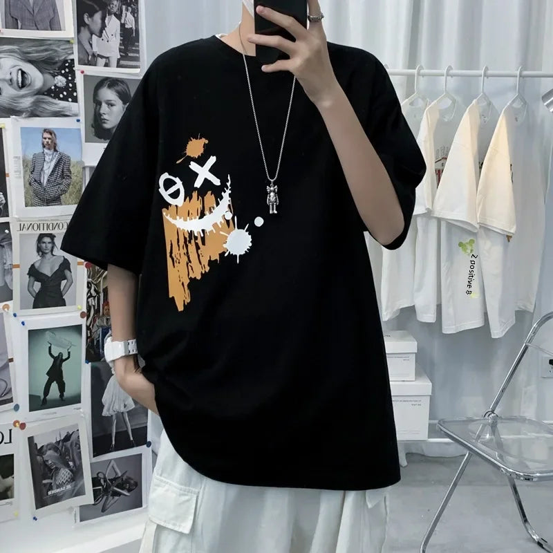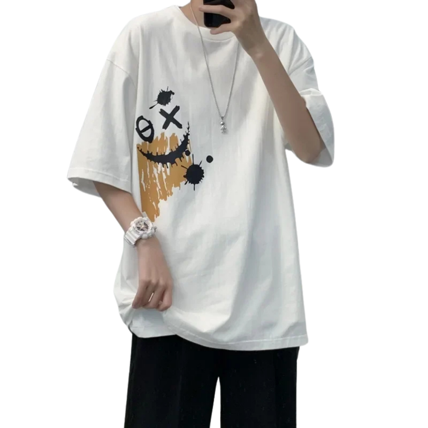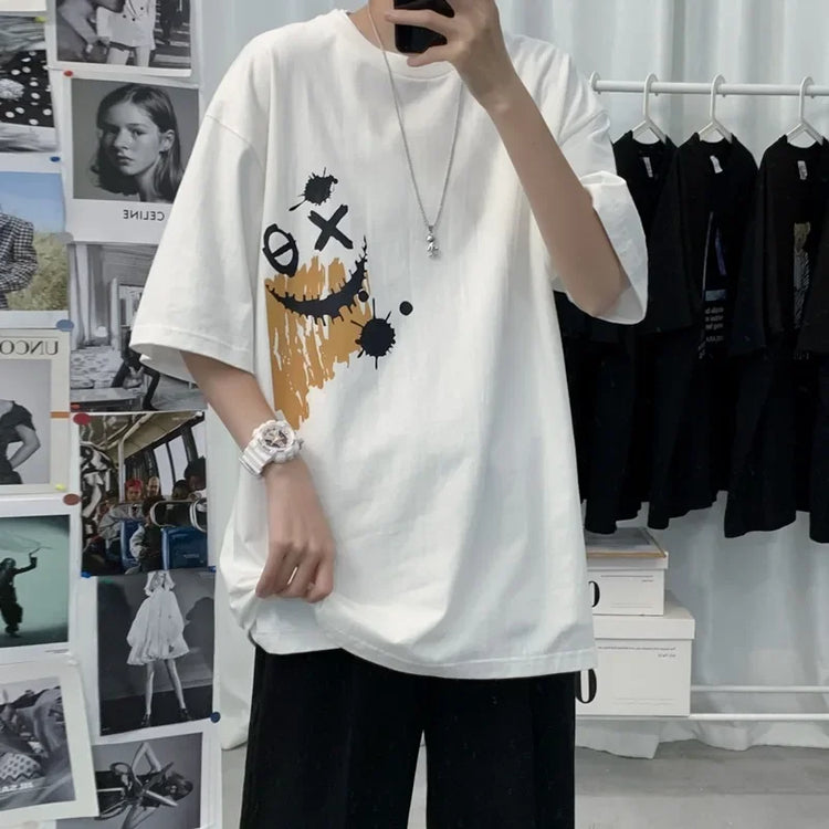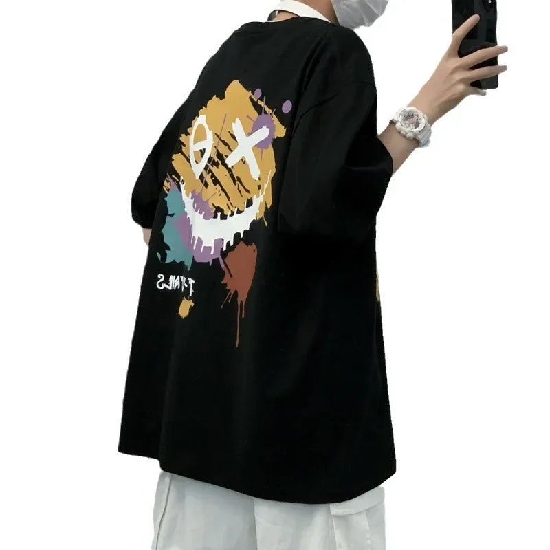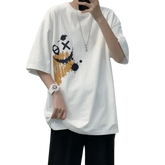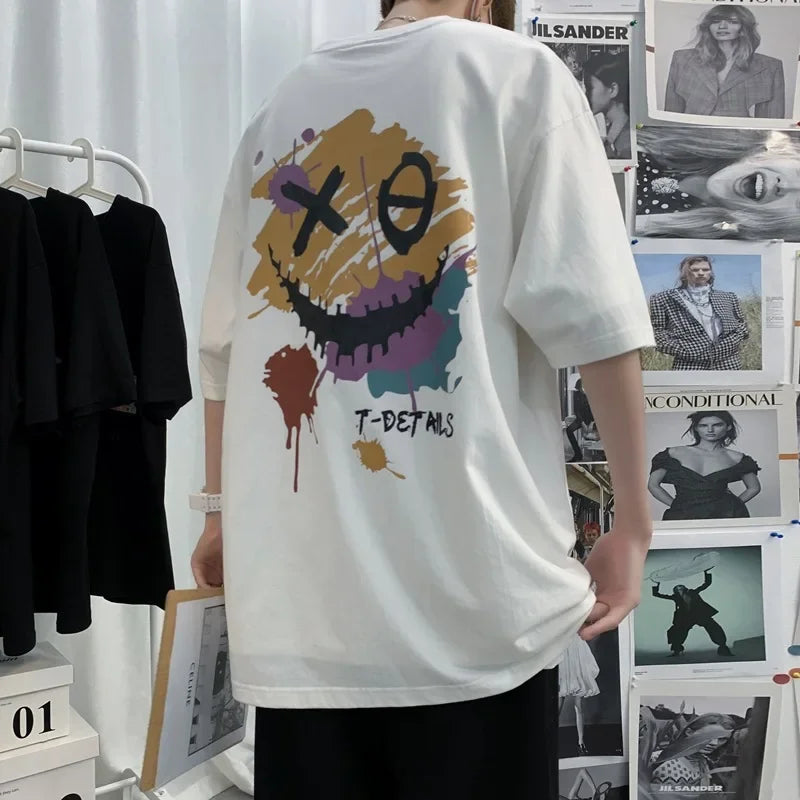 An oversized T-shirt with a unique graphic design featuring a distressed smiley print that adds character and urban style. Made from soft, pleasant-to-the-touch cotton fabric, suitable for comfortable daily wear throughout the day. The wide fit provides a relaxed and trendy look, easily paired with jeans, sweatpants, or an updated street style. A perfect item for those looking for a T-shirt with presence and an unconventional design. Suitable for a casual everyday style with a unique touch.